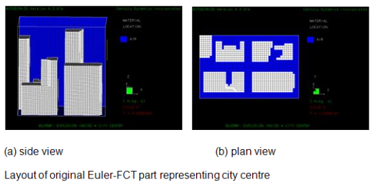 The final stage of the analysis can be performed using the full model. This model is reloaded and the results stored in file BLKRP2 are remapped into the entire Euler-FCT part to give the initial conditions for the final phase of the analysis as shown below in figure a. The propagation of the blast wave can then be tracked though the remainder of the city center as shown in figure b.