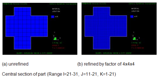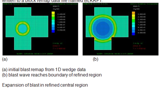 The analysis of the detonation of the spherical charge is initially performed using a 1D wedge analysis which is then remapped into the refined grid as shown below. The expansion of the blast wave in the central region of the city is then performed using the refined 3D Euler-FCT grid until the wave front reaches the boundaries of the refined region as shown in figure b. At this point the results for this analysis are written to a block remap data file named BLKRP1.