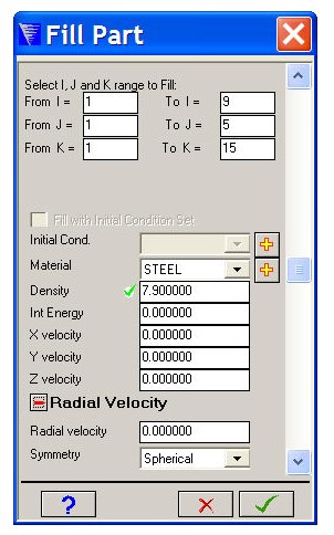 If you do not want to use an Initial Condition Set, enter parameter values for your fill (Density, Energy, Velocity).