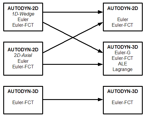These data files are commonly used for remapping solutions from 1D Wedge, 2D axysymmetric and 3D models into other 2D / 3D models. The figure below illustrates the remap operations available in Autodyn: