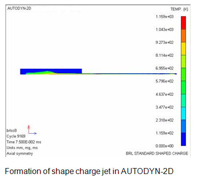 An example of a shaped charge analysis is shown in the below. The formation of the shaped charge jet is first modeled using the multi-material Euler solver in Autodyn-2D, as shown below. A remap data file is created at the desired wrap-up time.