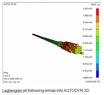 In Autodyn-3D the results from the 2D multi-material Euler analysis are remapped into the empty 3D Lagrangian part. The Lagrangian cells that contain more than 50% material following the remap are set as used cells. The profile of the Lagrangian jet will therefore not exactly match that of the 2D case, although accuracy can be enhanced by using the greatest level of refinement that computation time constraints will allow. Note that the constitutive state variables and velocities for the used cells are also remapped into the 3D analysis. An example of the tip of a shaped charge jet following the remap procedure described above is shown below.
