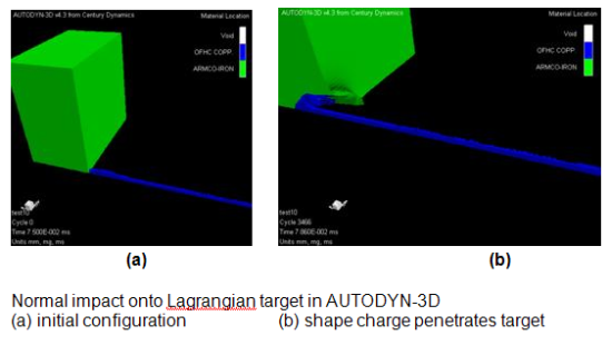 The 3D Lagrangian part can then be translated or rotated and used in several analyses including normal and oblique impacts onto several different targets. The following figures show an example in which a Lagrangian target has been introduced into the analysis and the penetration of the jet into the target has been simulated. Note that erosion models were included for both the jet and target materials.
