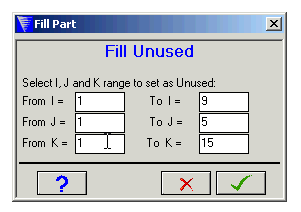 Contents Parts | 10.10. Parts - Fill | Print page 10.10.4. Parts - Fill - UnusedThis window lets you fill a block in index space with Unused elements (previous materials occupying the elements are removed).Enter the index range of the block you want to fill and click . « 10.10.3. Parts - Fill - Node 10.10.5. Parts - Fill - Composite »