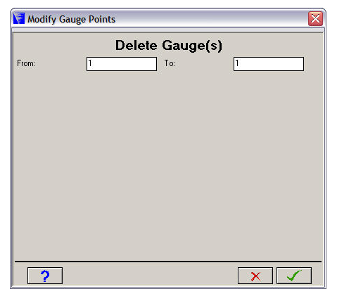 Contents Parts | 10.12. Parts - Gauges | Print page 10.12.3. Parts - Gauge - DeleteThis window lets you delete one or more gauges.Enter the range of the gauge numbers you want to delete and click . « 10.12.2. Parts - Gauge - Move 10.12.4. Parts - Gauges - Add Unstructured »