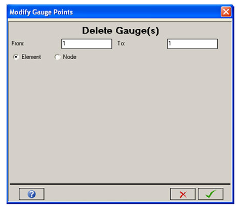 Contents Parts | 10.12. Parts - Gauges | Print page 10.12.6. Parts - Gauge - Delete UnstructuredThis window lets you delete one or more gauges.Enter the range of the gauge numbers you want to delete and click . « 10.12.5. Parts - Gauge - Move Unstructured 10.13. Parts - Solvers (Structured) »