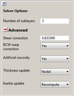 Choose whether to apply artificial viscosity to compression waves in the shell. The values for the quadratic and linear coefficients and whether to use the linear term in the expansion come from the global settings for artificial viscosity which can be found under the Damping Options in the Controls menu.