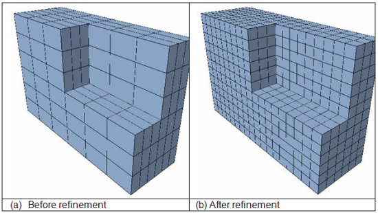 The refining algorithms are by default applied to all cells within a part. In order to limit the range of cells within a part that undergo refinement, you can select an appropriate IJK-RANGE first. In addition it should be noted that the following limitations apply to the refinement of Euler and ALE parts.