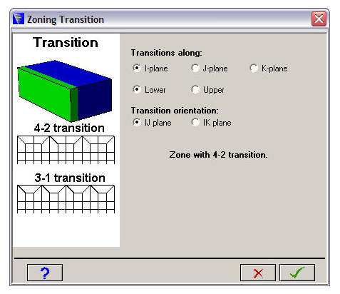 Specify at which of the six surfaces of the block you want your transition to be created, by selecting and I, J or K-plane and whether it is the corresponding lower or upper surface of the block.