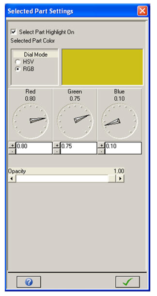 The default highlight color is golden yellow; you may alter the color and opacity of the highlight color that is applied to selected parts using the associated options panel.