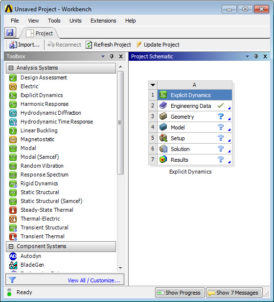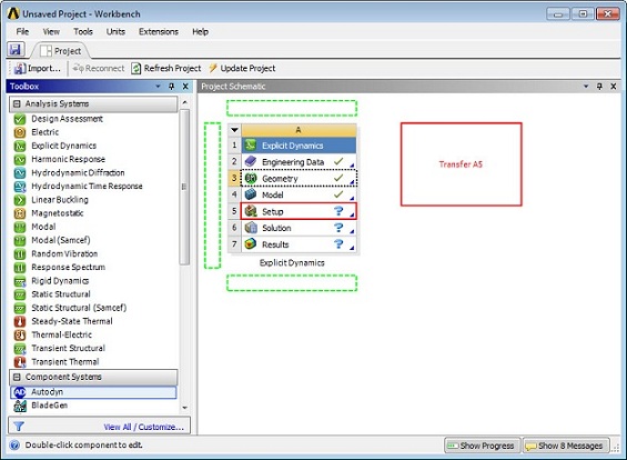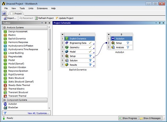 Go to the Project Schematic and drag an Autodyn Component System onto cell A5 to generate the link between the Setup cell (A5) of the Explicit Dynamics system and the Setup cell (B2) of the Autodyn Component System.