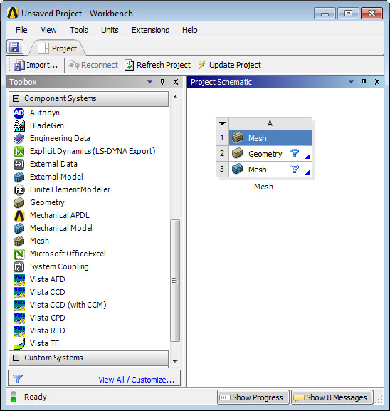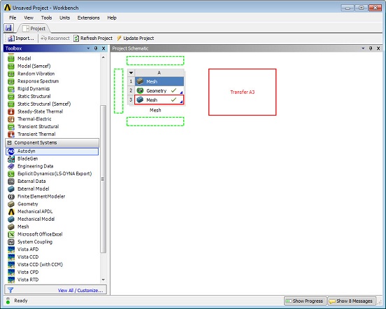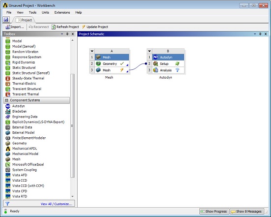 Go to the Project Schematic, drag an Autodyn Component System onto cell A3, to generate the link between the Mesh cell (A3) of the Mesh system and the Setup cell (B2) of the Autodyn Component System.