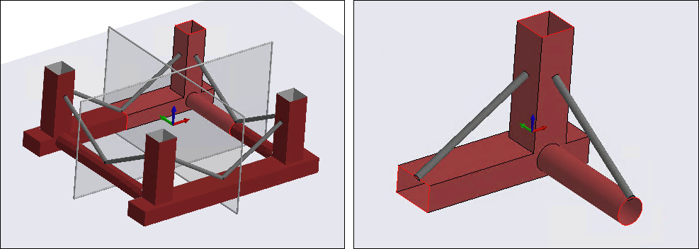 You can use geometric symmetry to improve the efficiency of the Hydrodynamic Diffraction analysis. For example, the model below has been simplified by modeling only one quarter of the geometry and applying two symmetry planes.