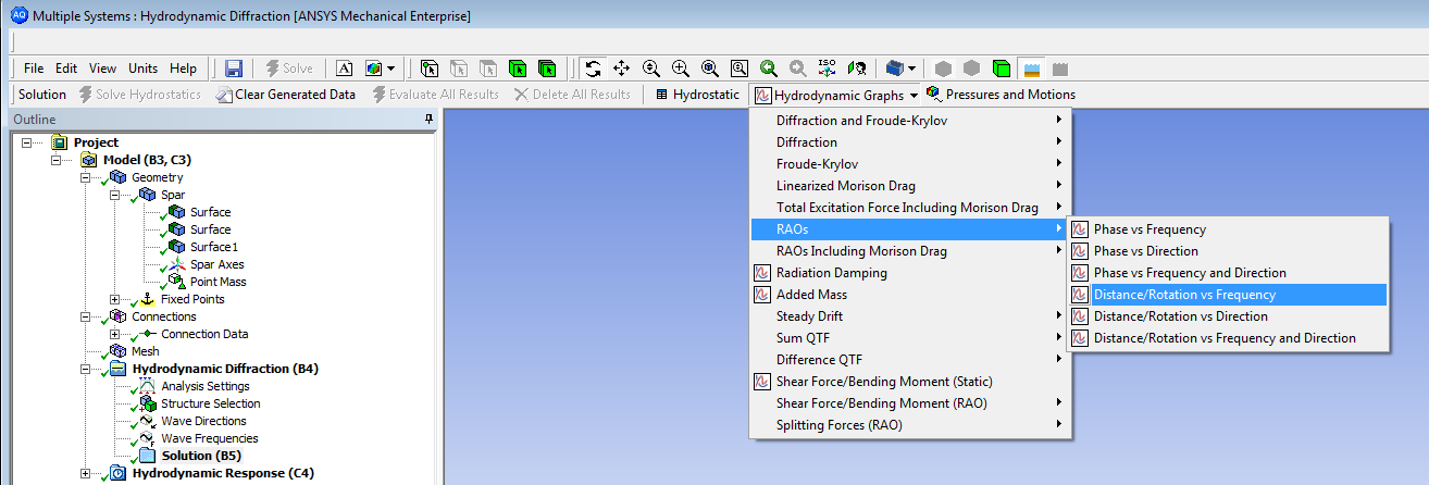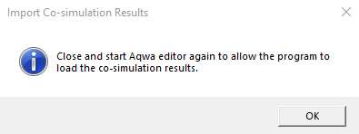 For certain types of Hydrodynamic Response analyses, the results can also be read from the external co-simulation result files by selecting Import Co-simulation Results. However, the co-simulation result files must be derived from solving the Aqwa-FMU package generated by the selected Hydrodynamic Response analysis and the model or analysis settings must not be modified since the generation of the Aqwa-FMU package. Once Import Co-simulation Results is selected, the program will ask for the location of the Aqwa co-simulation input .DAT file in the co-simulation result file folder. All the corresponding Aqwa co-simulation result files will be copied into the solver file directory of the selected Hydrodynamic Response analysis. The time settings of the Hydrodynamic Response analysis will be altered to the co-simulation time settings. After the Aqwa Workbench editor has been closed and re-opened as suggested in the message below, the co-simulation results can be evaluated in Solution.