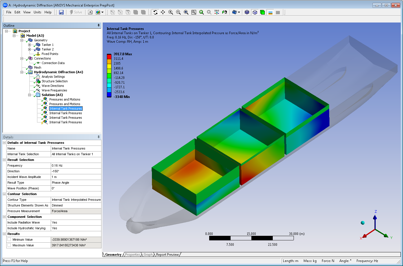 The Internal Tank Pressures results object enables the visualization and display of a number of results generated from Aqwa once a hydrodynamic solve has been performed. Any number of Internal Tank Pressures results may be added.