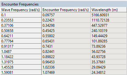 If the Hydrodynamic Diffraction analysis is to be performed over a single Wave Direction with a Forward Speed defined, a table of the encounter frequencies in the analysis will be displayed in the Table tab of the Encounter Frequencies panel. The number of encounter frequencies will always be equal to the number of defined incident wave frequencies.