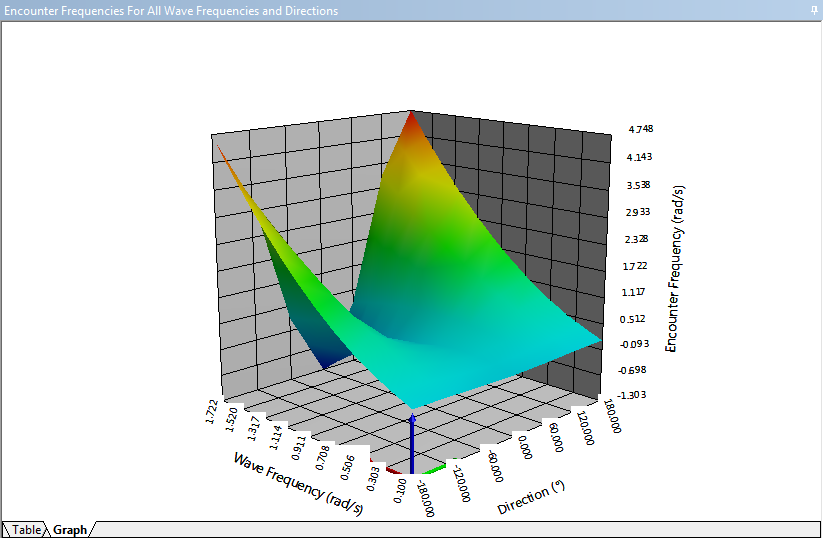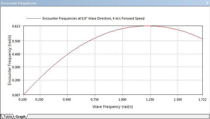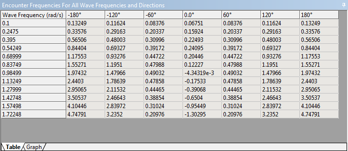 When Display Encounter Frequencies is set to In Hydrodynamic Analysis Only, the Table tab will show the subset of encounter frequencies that Aqwa will choose to include in the hydrodynamic database. The Graph tab will show these encounter frequencies in ascending sequence order.