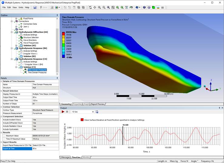 The Time Domain Pressures result shows the pressures at the element centroids, and can be directly compared with results in Mechanical once a load transfer procedure has been completed (see The Hydrodynamic Pressure Mapping Add-On for more information).