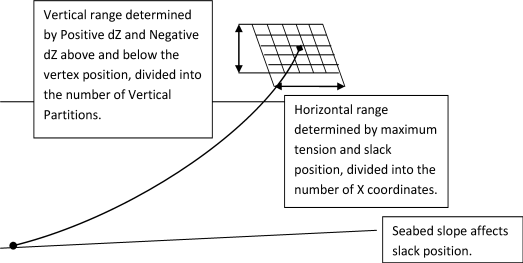 For cables attached between a fixed point and a structure (Connectivity set to ), the range of the possible end points of the cable is determined by Negative dZ Range of Expected Connection Point Vertical Motion (measured from the lowest anticipated database point to the connection point in the definition position) and Positive dZ Range of Expected Connection Point Vertical Motion (measured from the connection point in the definition position to the highest anticipated database point) along with the slack and maximum tension positions (including the effects of the global or cable-specific seabed slope). This area is then divided up to form a database of cable end positions and corresponding tensions which is used in the analysis. It is recommended that the full size of this grid is used, of 600 points, which is formed by the multiplication of Number of Vertical Partitions and Number of X Coordinates.