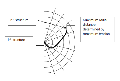 For cables attached between two structures (Connectivity set to ), where the Seabed Touchdown Expected option is set to No, the range of the possible end points of the cable is determined by the relative positions of the two structures along with the slack and maximum tension range. The cable is considered to be submerged in water of infinite depth. It is recommended that the full size of the database is used, of 600 points, which is formed by the multiplication of Number of Vertical Partitions and Number of X Coordinates.