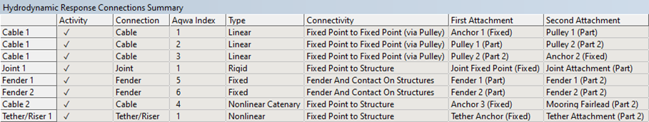 When the Connections object is selected in the Outline tree, and there are one or more Cables, Tethers/Risers, Fenders, or Joints defined, the Hydrodynamic Response Connections Summary table will be displayed: