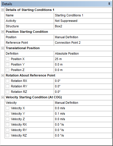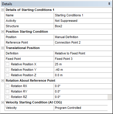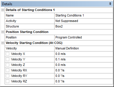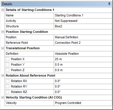 Depending on the analysis, it is possible to set a starting position and/or a starting velocity for a structure using the Details panel in a Starting Conditions object.