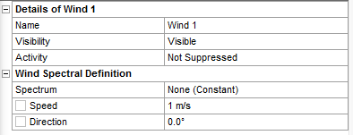 The wind type of Constant Velocity is permitted for any wave type. Enter the Speed and Direction of the constant wind in the Wind Spectral Definition section of the Details panel.