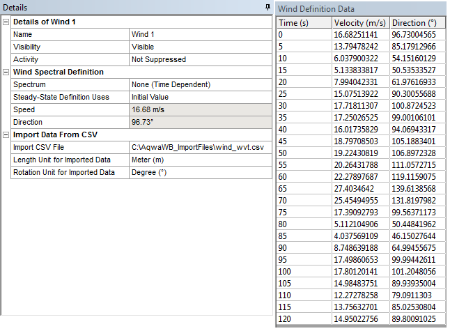The rows of the Wind Definition Data table are automatically sorted in ascending order of Time. Duplicate Time entries are not valid, and the Time in the last row of the table must equal or exceed the Finish Time defined in the Analysis Settings object.