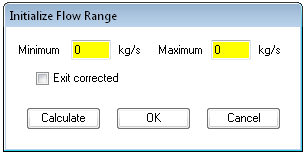 For a given speedline, the default mass flow range is centered on the base duty mass flow scaled by the rotational speed percentage for the speedline, or, if the Exit corrected option is selected, on the base duty mass flow. If the speedline already has a range of flow rates then the existing minimum and maximum values will be entered. If there is a change to the base duty mass flow or speedline rotational speed, you might want to recompute new default range values. You can do this using the Calculate button.