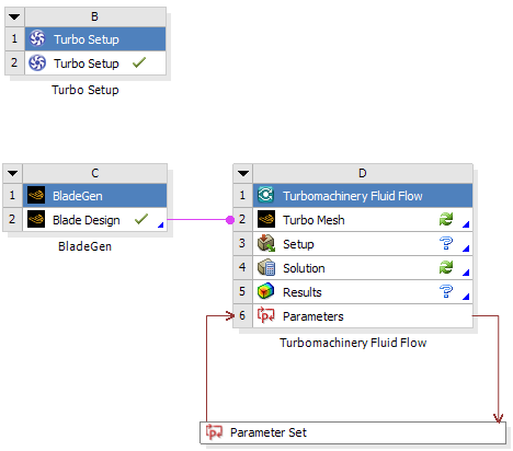 The Turbomachinery Fluid Flow system is an analysis system that combines TurboGrid and CFX component systems. This is subsequently created from the up-to-date Turbo Setup system and linked to the upstream impeller Blade Design cell. The Turbomachinery Fluid Flow system is ready to update to calculate a duty point steady-state fluid flow analysis of the impeller using CFX.