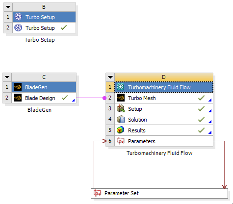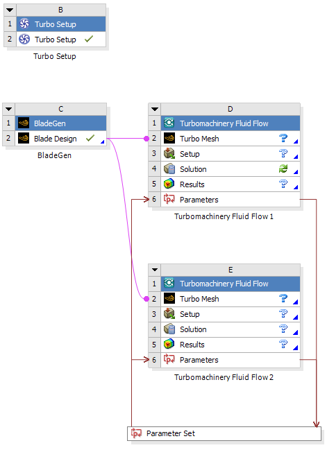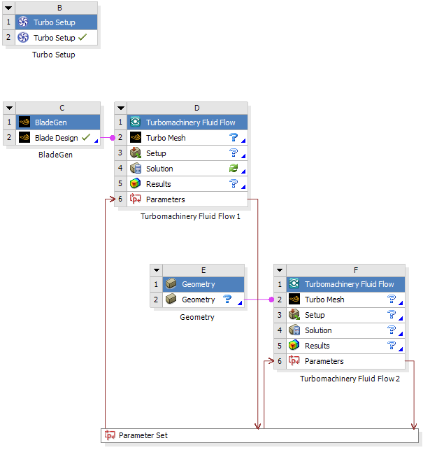 This workflow is very similar to the first but uses an additional analysis system that could, for example, use a different turbulence model. Both Turbomachinery Fluid Flow systems use the same geometry, input parameters, and operating points, but multiple sets of resulting output parameters are retrieved by the Turbo Setup system for postprocessing and comparison.