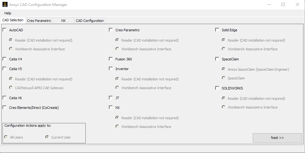 Windows: For additional information about using this tool to setup your Ansys CAD products see Using the CAD Configuration Manager in the Ansys, Inc. Windows Installation Guide.