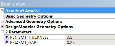 When a CAD file is imported into the DesignModeler application, its parameters are listed in the Attach feature’s Details View. These parameters are not exposed to Workbench, but can be promoted by clicking the check box next to each parameter. Both independent and dependent parameters may be promotoed.
