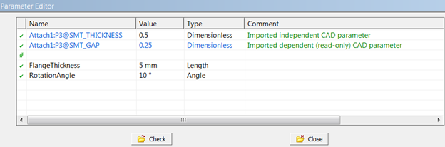 Once promoted, imported CAD parameters can be modified in the Design Parameters tab of the Parameter Editor, if they are independent parameters. Dependent parameters are never editable and will be published as output parameters in the Project Schematic.
