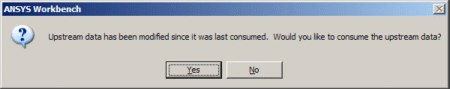 Clicking Yes to the dialog will import the latest parameter values from Workbench, along with any upstream input data that has not been consumed. Choosing No, will not update parameters in the DesignModeler application's editor, but the cell state in the schematic will remain as Refresh Required until a refresh is performed in the application.