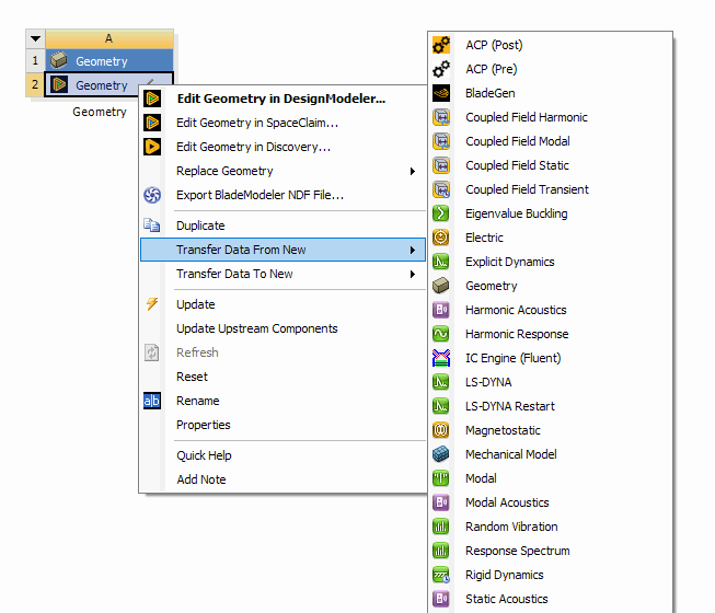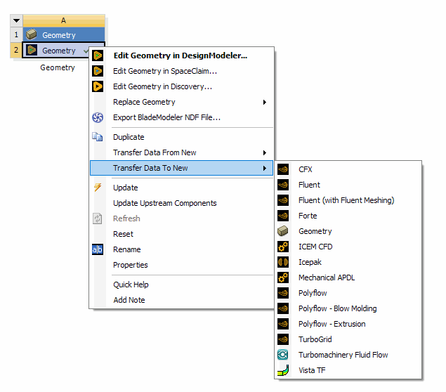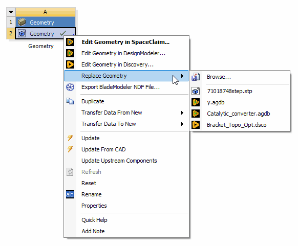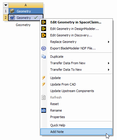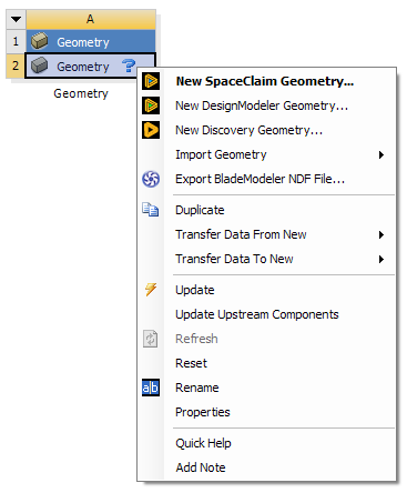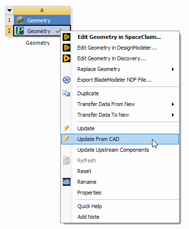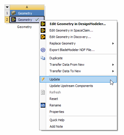 The Edit context menu option will appear when the geometry cell already has a CAD file, active CAD model, or agdb file defined. It is the default action when a user double-clicks the geometry cell under these conditions. The option will NOT appear if the geometry cell is empty. If a file is specified but is a type that cannot be edited in the DesignModeler or SpaceClaim application, then the Edit option will appear but is disabled. If you choose the Edit option while the geometry application's editor for that system is already open, then it will simply switch focus to that open editor.