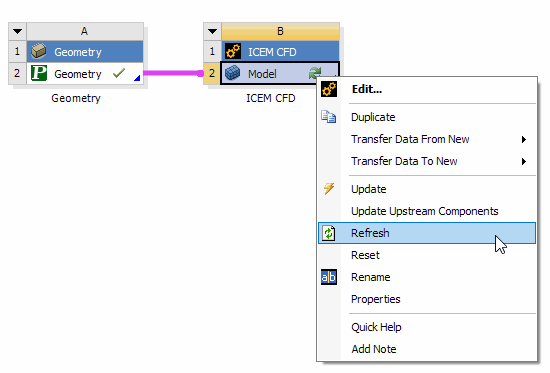 The Refresh command will force the DesignModeler application to refresh its upstream input data. Upstream input data can come from a Provides-To connection supplying data to the geometry cell or parameter changes made in Ansys Workbench that have not yet been consumed by the DesignModeler application's editor. The Refresh menu item is not applicable when there are no upstream changes to consume.