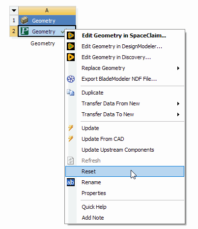 The Reset option will delete any geometry files associated with the cell and clear its contents. Several things happen during this operation: