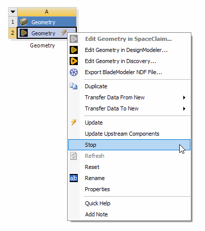 The Stop operation will appear only when the DesignModeler application's editor is open. The operation will terminate the editor and discard any changes you have made since the DesignModeler application's data was last saved.