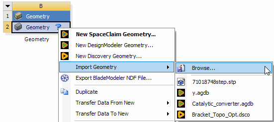 The middle section of the Import Geometry context menu is shown only if there are one or more running CAD sessions. With SpaceClaim, this is only if those sessions are not already connected to a geometry cell. The entries show CAD active models.