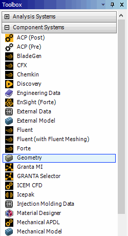 Double-clicking the Geometry item in the Toolbox will create a new stand-alone geometry system in the project schematic. When a system is first created, you have the option to rename it. Component Geometry systems are simply named "Geometry" by default.
