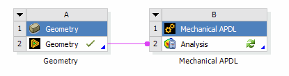 Mechanical APDL (Analysis cell): If the geometry cell contains the DesignModeler or SpaceClaim application geometry, it is exported to an ANF file which the Mechanical APDL system then consumes. It can also read Parasolid, IGES, and STEP files directly from the geometry cell without needing the DesignModeler or SpaceClaim application. If any other file type is present in the geometry cell, then it must be edited in the DesignModeler or SpaceClaim application before it can be transferred to Mechanical APDL.