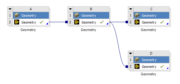 The geometry cell can establish a Shares-With connection to any other geometry cell in the project by dragging and dropping cells onto each other. A geometry cell may share its data with any number of downstream cells, but it can only receive shared data from a single source, as shown in system B of the project schematic below: