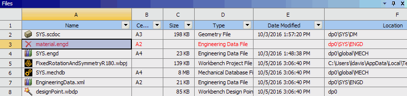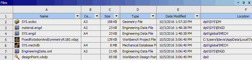 Note that files used in the agdb files may not appear until the agdb has been opened in DesignModeler. A typical project file list may look like this: