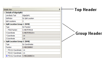 Split by Coordinates is an Apply/Cancel button property that facilitates the selection of the coordinates. The coordinates can be created on 3D edges only. The group properties shown in the Details View are: