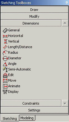 Use the Dimensions toolbox to define your sketch.Because the numbers for dimension names begin at 1 for each plane, there can be, for example, H1 and V2 in many different planes. They remain unique as the name is associated with the plane to which they belong. When creating dimensions, while placing the dimension on the plane, you can click the right mouse button to Cancel (delete the current dimension), change whether or not a dimension automatically changes position when its associated geometry changes, or select Edit Name/Value. This will pop up a dialog box that allows you to change the name and/or value before indicating the location for the dimension. For Reference dimensions, or dimensions being created with Semi-Automatic, you can only modify the name, not the value. You can also access the dialog box via the right mouse button when you select a dimension from the general select mode.