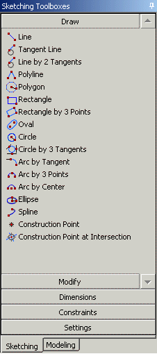 The Draw toolbox is displayed by default when you enter the Sketching mode. Use the tools to draw 2D edges and apply dimensions and constraints.