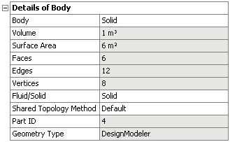 The very last branch of the Tree Outline contains the bodies and parts of the model. A body is a single component in the model, either a Solid, Surface, or Line body. A part is a collection of bodies grouped together. In the Details View for each body or part are statistics: