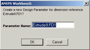 Feature and sketch dimensions contain check boxes next to their properties in the Details View. When the check box is clicked, a dialog box will appear which allows you to give the design parameter a name. Design Parameter names cannot contain spaces, nor special characters, nor can they begin with a numeric character. After clicking OK, the DesignModeler application creates the design parameter in the Design Parameters tab and then assigns the feature or sketch dimension to that design parameter in the Parameter/Dimension Assignments tab.