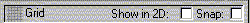 This gives access to the grid options: grid visibility, Show in 2D on/off, as well as snap behavior, Snap on/off. The grid guides you as you create your sketch. The grid is optional and you may sketch without it. The grid is not required to enable snapping.